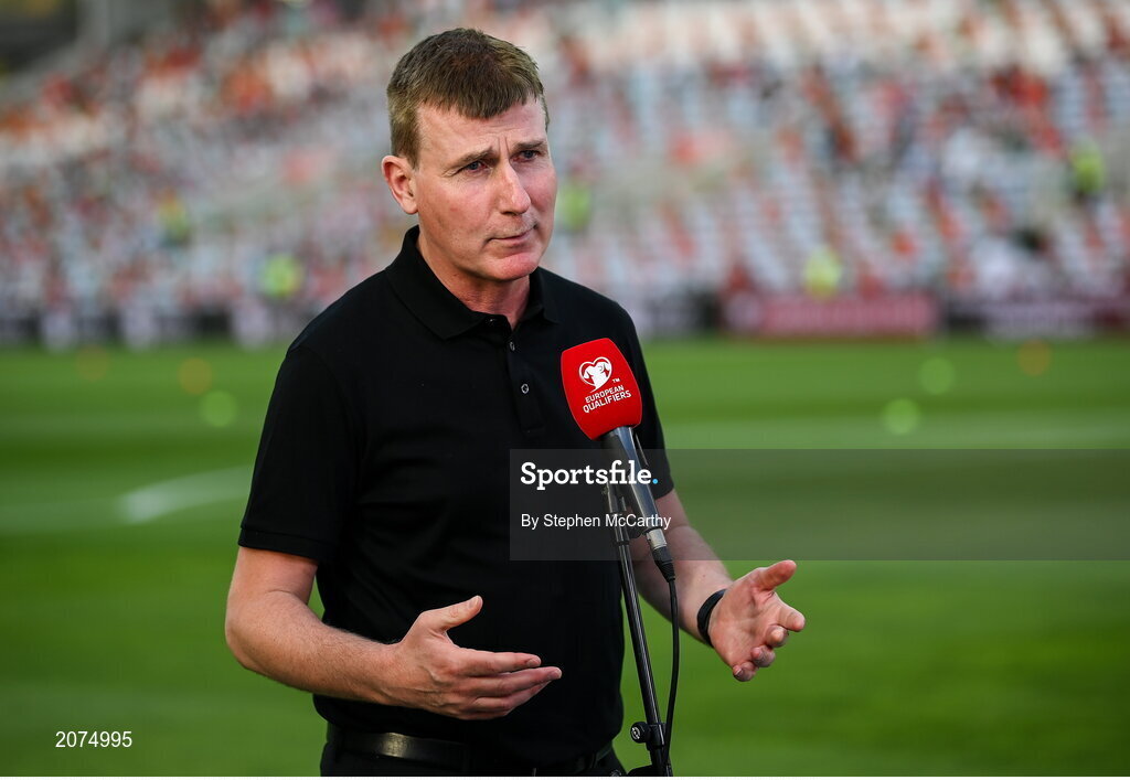 1 September 2021; Republic of Ireland manager Stephen Kenny is interviewed before the FIFA World Cup 2022 qualifying group A match between Portugal and Republic of Ireland at Estádio Algarve in Faro, Portugal. Photo by Stephen McCarthy/Sportsfile