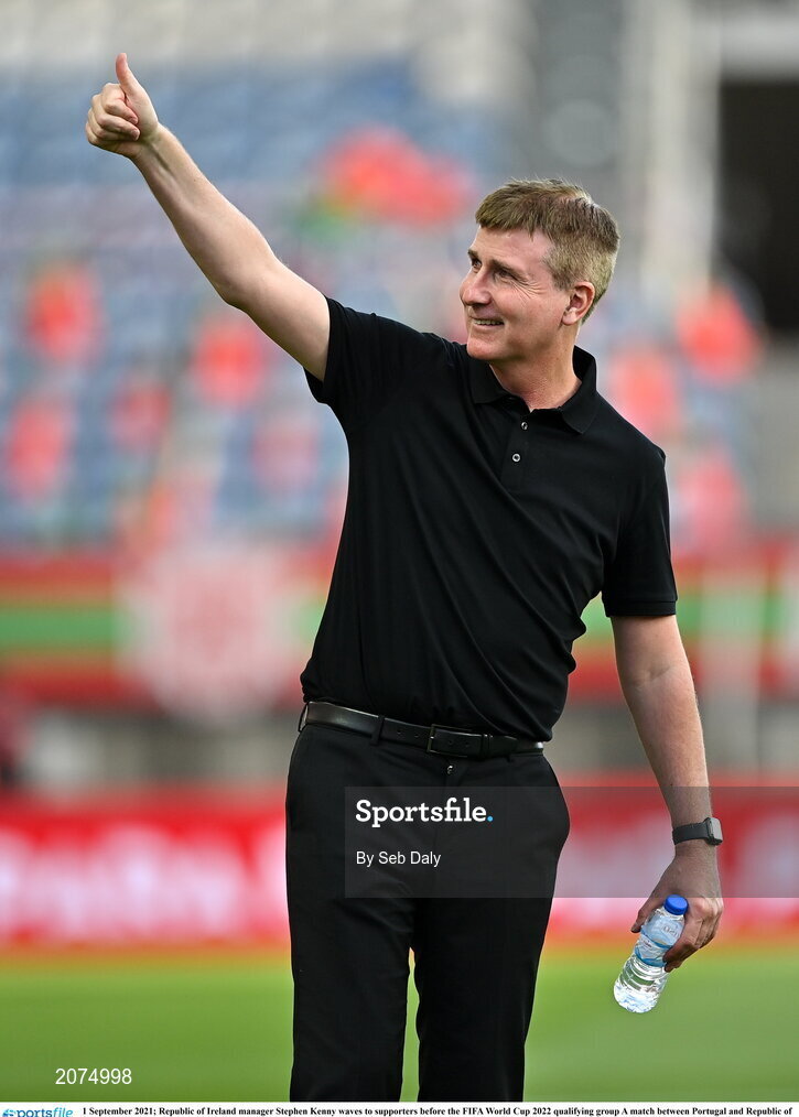 1 September 2021; Republic of Ireland manager Stephen Kenny waves to supporters before the FIFA World Cup 2022 qualifying group A match between Portugal and Republic of Ireland at Estádio Algarve in Faro, Portugal. Photo by Seb Daly/Sportsfile