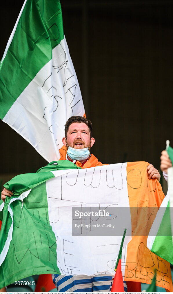 1 September 2021; A Republic of Ireland supporter before the FIFA World Cup 2022 qualifying group A match between Portugal and Republic of Ireland at Estádio Algarve in Faro, Portugal. Photo by Stephen McCarthy/Sportsfile