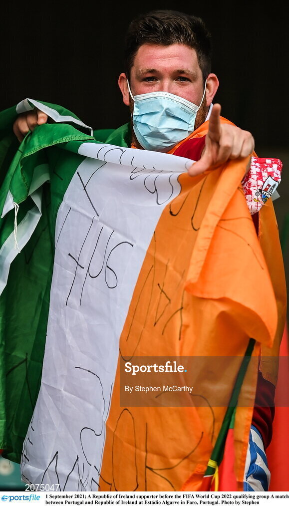 1 September 2021; A Republic of Ireland supporter before the FIFA World Cup 2022 qualifying group A match between Portugal and Republic of Ireland at Estádio Algarve in Faro, Portugal. Photo by Stephen McCarthy/Sportsfile