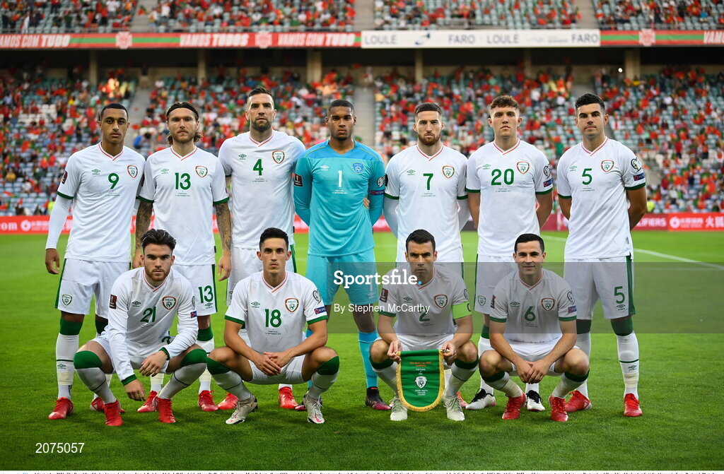 1 September 2021; The Republic of Ireland team, back row, from left, Adam Idah, Jeff Hendrick, Shane Duffy, Gavin Bazunu, Matt Doherty, Dara O'Shea and John Egan. Front row, from left, Aaron Connolly, Jamie McGrath, Seamus Coleman and Josh Cullen before the FIFA World Cup 2022 qualifying group A match between Portugal and Republic of Ireland at Estádio Algarve in Faro, Portugal. Photo by Stephen McCarthy/Sportsfile