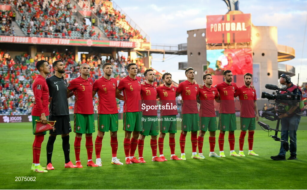 1 September 2021; The Portugal team stand for their national anthem before the FIFA World Cup 2022 qualifying group A match between Portugal and Republic of Ireland at Estádio Algarve in Faro, Portugal. Photo by Stephen McCarthy/Sportsfile