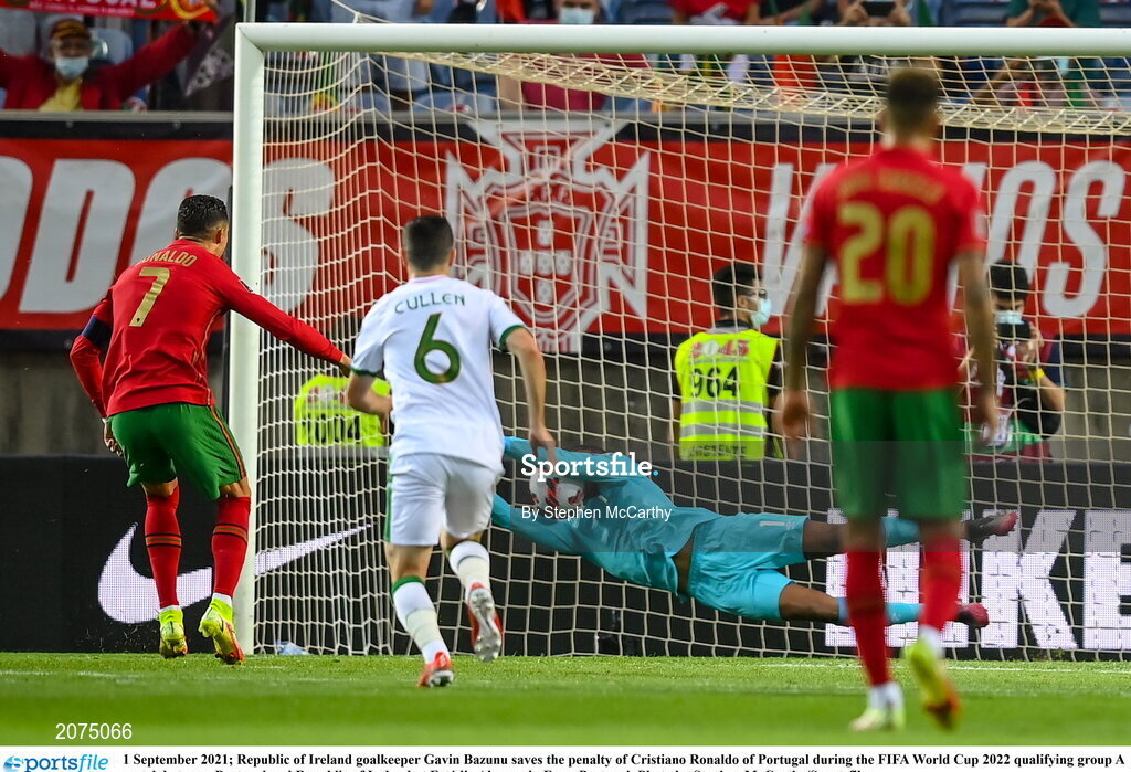 1 September 2021; Republic of Ireland goalkeeper Gavin Bazunu saves the penalty of Cristiano Ronaldo of Portugal during the FIFA World Cup 2022 qualifying group A match between Portugal and Republic of Ireland at Estádio Algarve in Faro, Portugal. Photo by Stephen McCarthy/Sportsfile