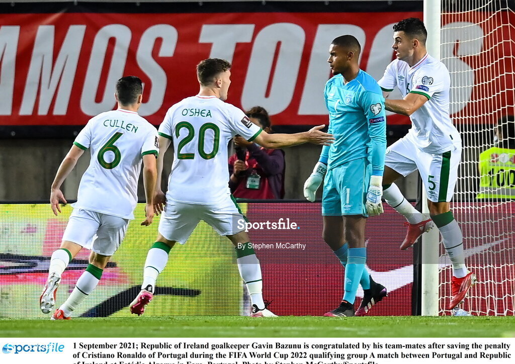 1 September 2021; Republic of Ireland goalkeeper Gavin Bazunu is congratulated by his team-mates after saving the penalty of Cristiano Ronaldo of Portugal during the FIFA World Cup 2022 qualifying group A match between Portugal and Republic of Ireland at Estádio Algarve in Faro, Portugal. Photo by Stephen McCarthy/Sportsfile