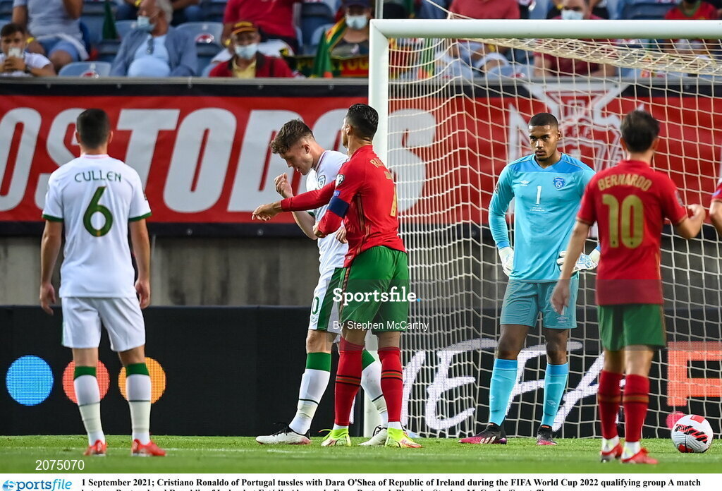 1 September 2021; Cristiano Ronaldo of Portugal tussles with Dara O'Shea of Republic of Ireland during the FIFA World Cup 2022 qualifying group A match between Portugal and Republic of Ireland at Estádio Algarve in Faro, Portugal. Photo by Stephen McCarthy/Sportsfile