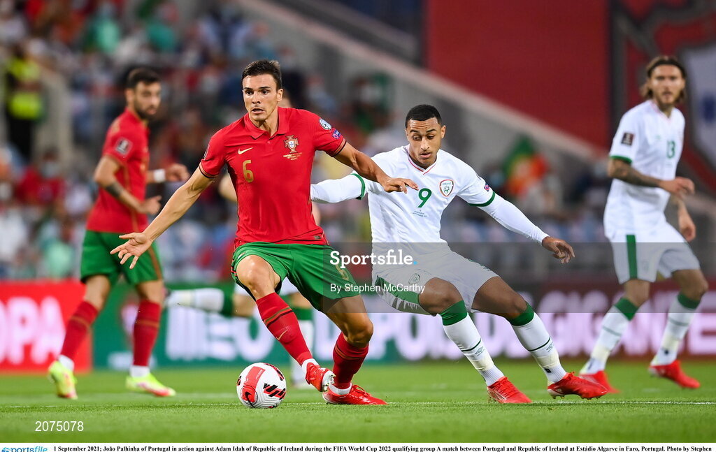 1 September 2021; João Palhinha of Portugal in action against Adam Idah of Republic of Ireland during the FIFA World Cup 2022 qualifying group A match between Portugal and Republic of Ireland at Estádio Algarve in Faro, Portugal. Photo by Stephen McCarthy/Sportsfile