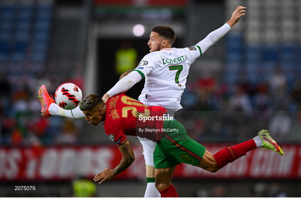 1 September 2021; Matt Doherty of Republic of Ireland in action against João Cancelo of Portugal during the FIFA World Cup 2022 qualifying group A match between Portugal and Republic of Ireland at Estádio Algarve in Faro, Portugal. Photo by Stephen McCarthy/Sportsfile