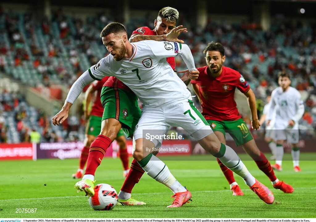 1 September 2021; Matt Doherty of Republic of Ireland in action against João Cancelo, left, and Bernardo Silva of Portugal during the FIFA World Cup 2022 qualifying group A match between Portugal and Republic of Ireland at Estádio Algarve in Faro, Portugal. Photo by Stephen McCarthy/Sportsfile