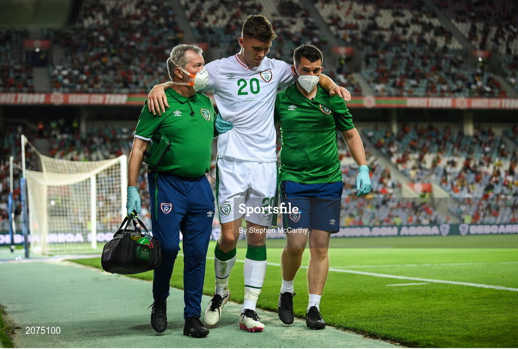 1 September 2021; Dara O'Shea of Republic of Ireland is assisted from the pitch by Republic of Ireland team doctor Alan Byrne, left, and chartered physiotherapist Kevin Mulholland after picking up an injury during the FIFA World Cup 2022 qualifying group A match between Portugal and Republic of Ireland at Estádio Algarve in Faro, Portugal. Photo by Stephen McCarthy/Sportsfile