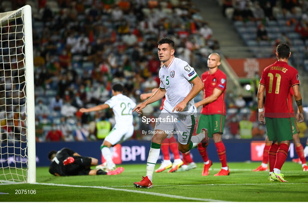 1 September 2021; John Egan of Republic of Ireland celebrates after scoring his side's first goal during the FIFA World Cup 2022 qualifying group A match between Portugal and Republic of Ireland at Estádio Algarve in Faro, Portugal. Photo by Stephen McCarthy/Sportsfile
