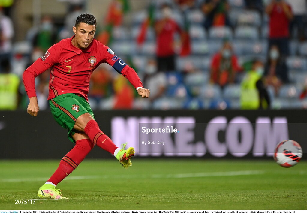 1 September 2021; Cristiano Ronaldo of Portugal takes a penalty, which is saved by Republic of Ireland goalkeeper Gavin Bazunu, during the FIFA World Cup 2022 qualifying group A match between Portugal and Republic of Ireland at Estádio Algarve in Faro, Portugal. Photo by Seb Daly/Sportsfile