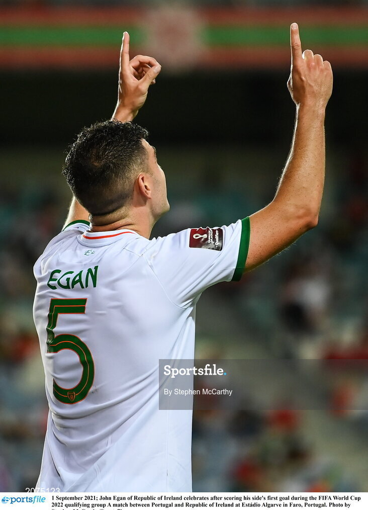 1 September 2021; John Egan of Republic of Ireland celebrates after scoring his side's first goal during the FIFA World Cup 2022 qualifying group A match between Portugal and Republic of Ireland at Estádio Algarve in Faro, Portugal. Photo by Stephen McCarthy/Sportsfile
