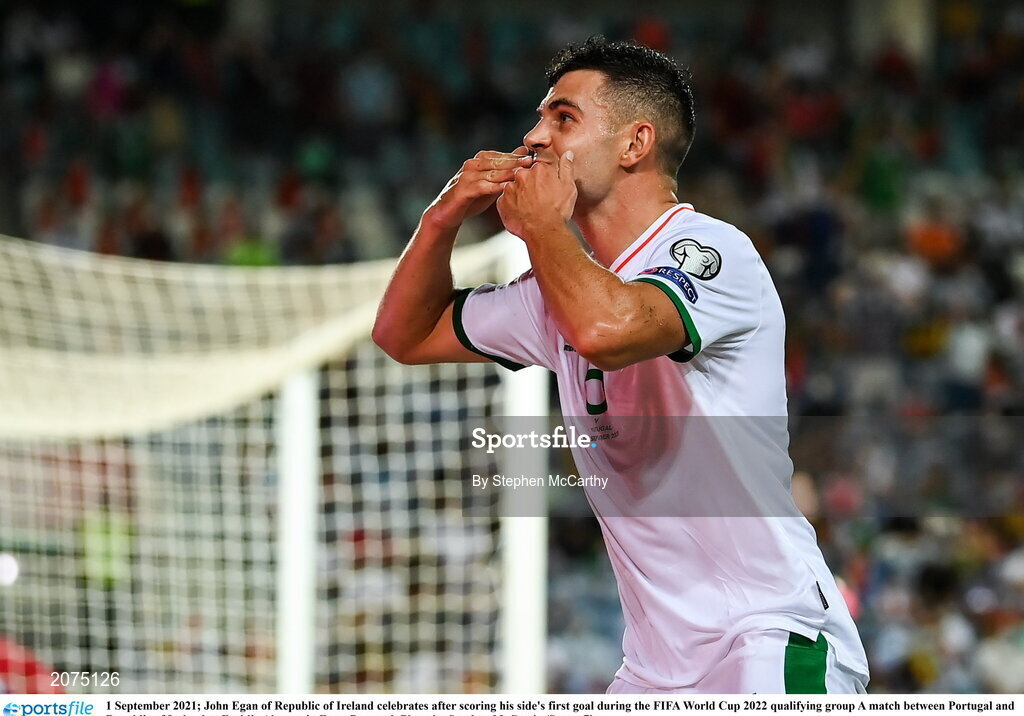 1 September 2021; John Egan of Republic of Ireland celebrates after scoring his side's first goal during the FIFA World Cup 2022 qualifying group A match between Portugal and Republic of Ireland at Estádio Algarve in Faro, Portugal. Photo by Stephen McCarthy/Sportsfile