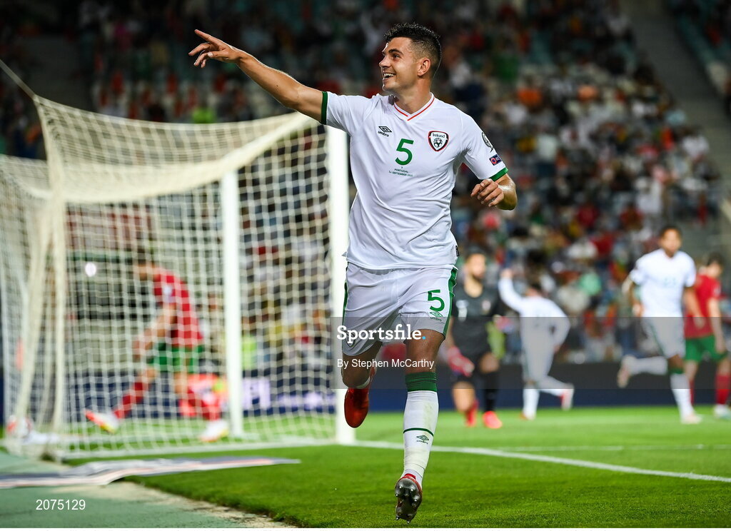 1 September 2021; John Egan of Republic of Ireland celebrates after scoring his side's first goal during the FIFA World Cup 2022 qualifying group A match between Portugal and Republic of Ireland at Estádio Algarve in Faro, Portugal. Photo by Stephen McCarthy/Sportsfile