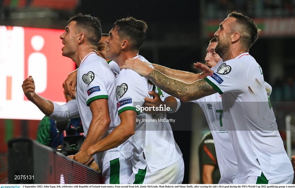 1 September 2021; John Egan, left, celebrates with Republic of Ireland team-mates, from second from left, Jamie McGrath, Matt Doherty and Shane Duffy, after scoring his side's first goal during the FIFA World Cup 2022 qualifying group A match between Portugal and Republic of Ireland at Estádio Algarve in Faro, Portugal. Photo by Stephen McCarthy/Sportsfile