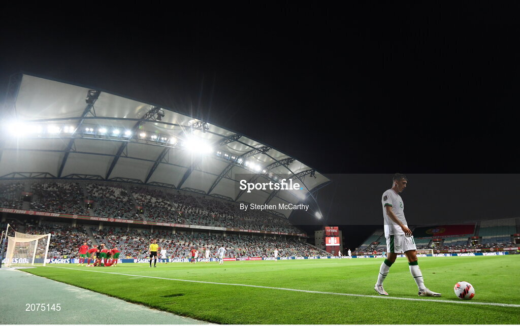1 September 2021; Jamie McGrath of Republic of Ireland prepares to take a corner kick during the FIFA World Cup 2022 qualifying group A match between Portugal and Republic of Ireland at Estádio Algarve in Faro, Portugal. Photo by Stephen McCarthy/Sportsfile