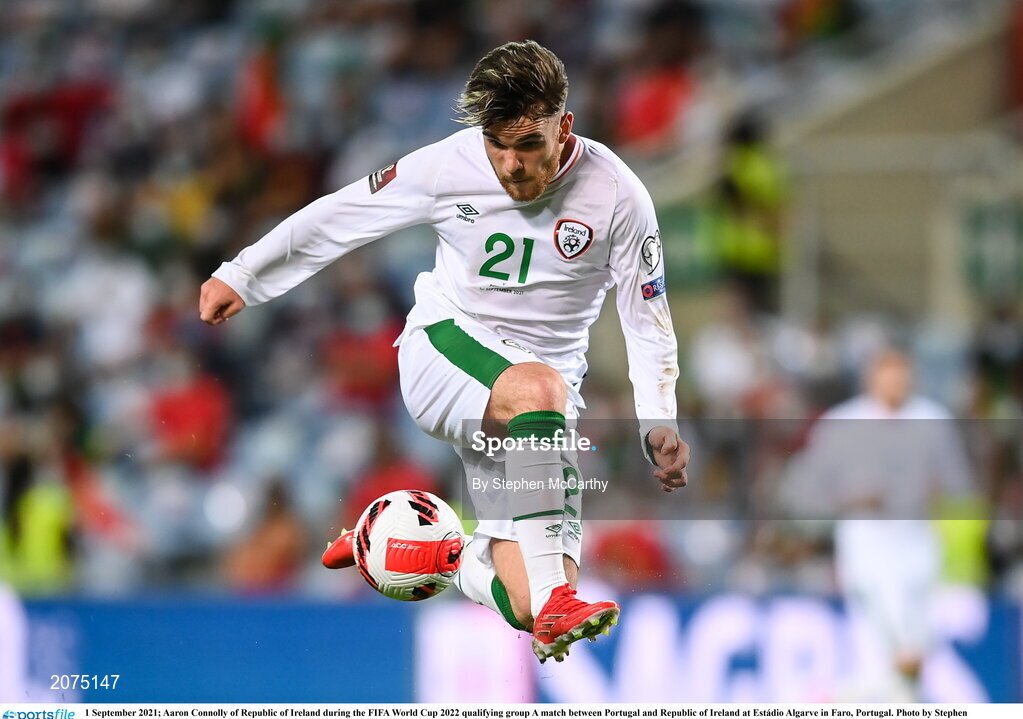 1 September 2021; Aaron Connolly of Republic of Ireland during the FIFA World Cup 2022 qualifying group A match between Portugal and Republic of Ireland at Estádio Algarve in Faro, Portugal. Photo by Stephen McCarthy/Sportsfile