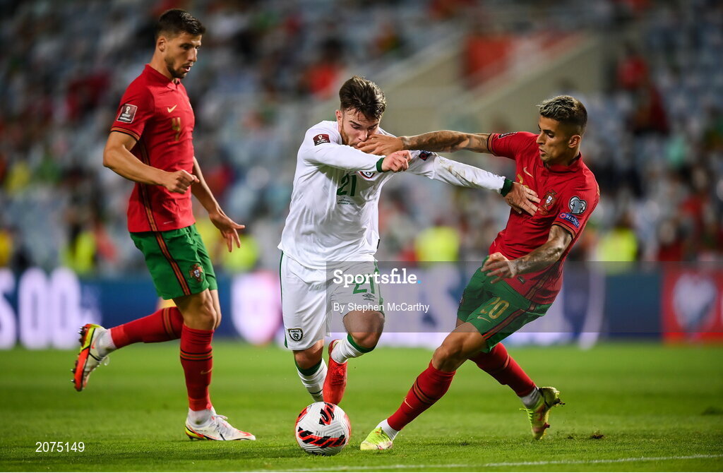 1 September 2021; Aaron Connolly of Republic of Ireland in action against João Cancelo of Portugal during the FIFA World Cup 2022 qualifying group A match between Portugal and Republic of Ireland at Estádio Algarve in Faro, Portugal. Photo by Stephen McCarthy/Sportsfile