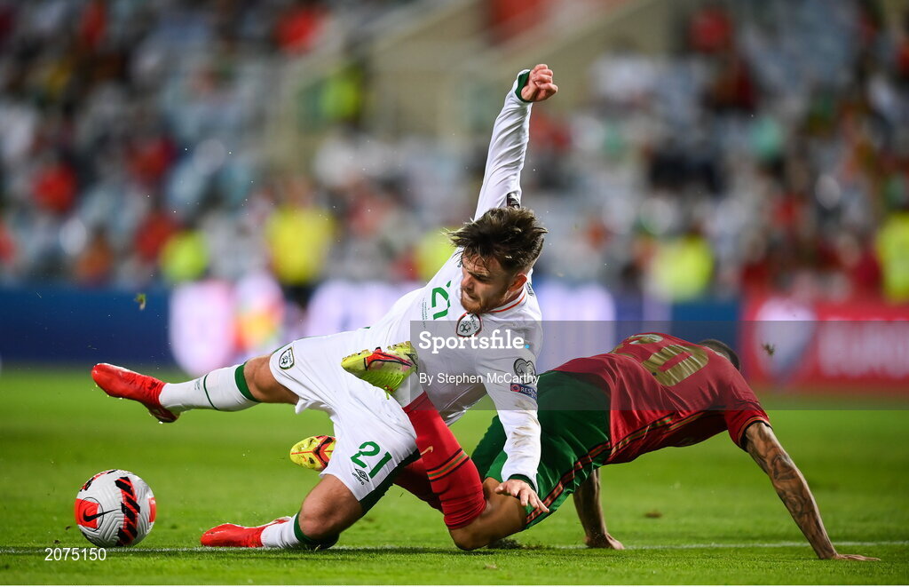 1 September 2021; Aaron Connolly of Republic of Ireland in action against João Cancelo of Portugal during the FIFA World Cup 2022 qualifying group A match between Portugal and Republic of Ireland at Estádio Algarve in Faro, Portugal. Photo by Stephen McCarthy/Sportsfile