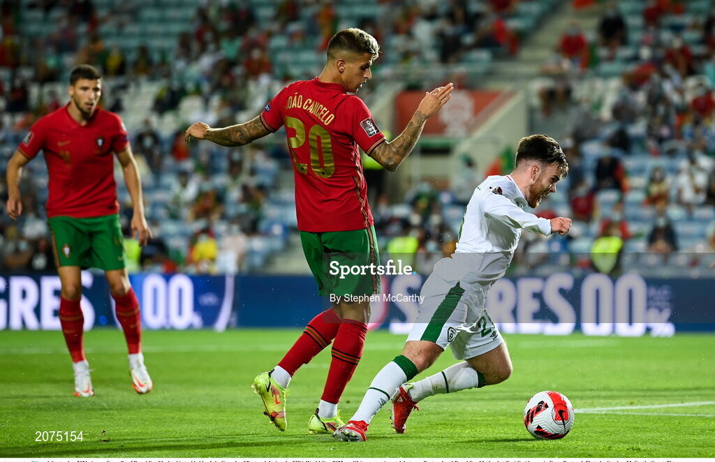 1 September 2021; Aaron Connolly of Republic of Ireland is tackled by João Cancelo of Portugal during the FIFA World Cup 2022 qualifying group A match between Portugal and Republic of Ireland at Estádio Algarve in Faro, Portugal. Photo by Stephen McCarthy/Sportsfile