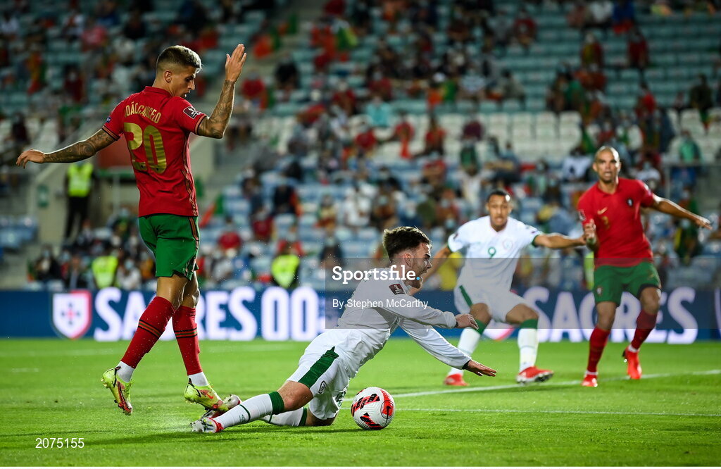 1 September 2021; Aaron Connolly of Republic of Ireland is tackled by João Cancelo of Portugal during the FIFA World Cup 2022 qualifying group A match between Portugal and Republic of Ireland at Estádio Algarve in Faro, Portugal. Photo by Stephen McCarthy/Sportsfile