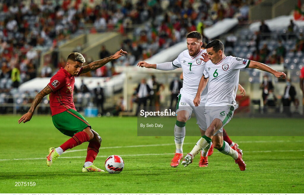 1 September 2021; João Cancelo of Portugal in action against Matt Doherty and Josh Cullen of Republic of Ireland during the FIFA World Cup 2022 qualifying group A match between Portugal and Republic of Ireland at Estádio Algarve in Faro, Portugal. Photo by Seb Daly/Sportsfile