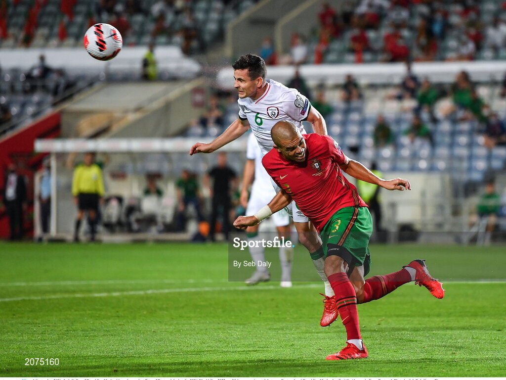 1 September 2021; Josh Cullen of Republic of Ireland in action against Pepe of Portugal during the FIFA World Cup 2022 qualifying group A match between Portugal and Republic of Ireland at Estádio Algarve in Faro, Portugal. Photo by Seb Daly/Sportsfile