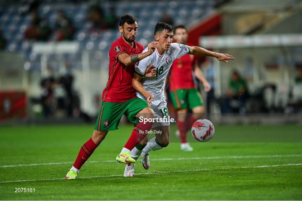 1 September 2021; Bruno Fernandes of Portugal in action against Jamie McGrath of Republic of Ireland during the FIFA World Cup 2022 qualifying group A match between Portugal and Republic of Ireland at Estádio Algarve in Faro, Portugal. Photo by Seb Daly/Sportsfile