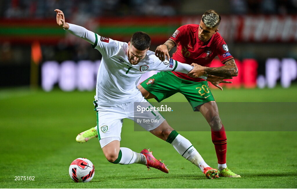 1 September 2021; Matt Doherty of Republic of Ireland in action against João Cancelo of Portugal during the FIFA World Cup 2022 qualifying group A match between Portugal and Republic of Ireland at Estádio Algarve in Faro, Portugal. Photo by Seb Daly/Sportsfile