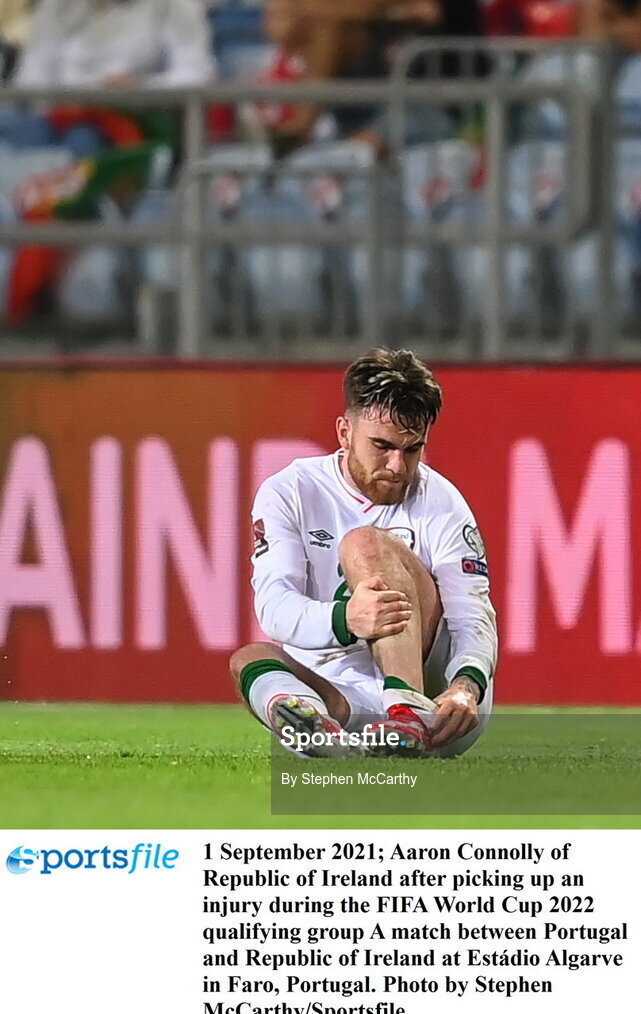 1 September 2021; Aaron Connolly of Republic of Ireland after picking up an injury during the FIFA World Cup 2022 qualifying group A match between Portugal and Republic of Ireland at Estádio Algarve in Faro, Portugal. Photo by Stephen McCarthy/Sportsfile