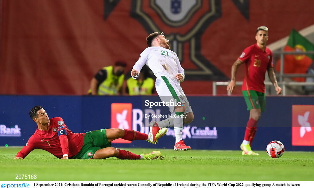 1 September 2021; Cristiano Ronaldo of Portugal tackled Aaron Connolly of Republic of Ireland during the FIFA World Cup 2022 qualifying group A match between Portugal and Republic of Ireland at Estádio Algarve in Faro, Portugal. Photo by Stephen McCarthy/Sportsfile