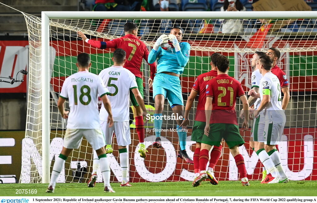 1 September 2021; Republic of Ireland goalkeeper Gavin Bazunu gathers possession ahead of Cristiano Ronaldo of Portugal, 7, during the FIFA World Cup 2022 qualifying group A match between Portugal and Republic of Ireland at Estádio Algarve in Faro, Portugal. Photo by Stephen McCarthy/Sportsfile