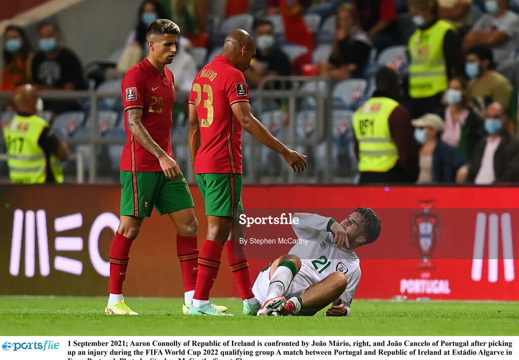 1 September 2021; Aaron Connolly of Republic of Ireland is confronted by João Mário, right, and João Cancelo of Portugal after picking up an injury during the FIFA World Cup 2022 qualifying group A match between Portugal and Republic of Ireland at Estádio Algarve in Faro, Portugal. Photo by Stephen McCarthy/Sportsfile