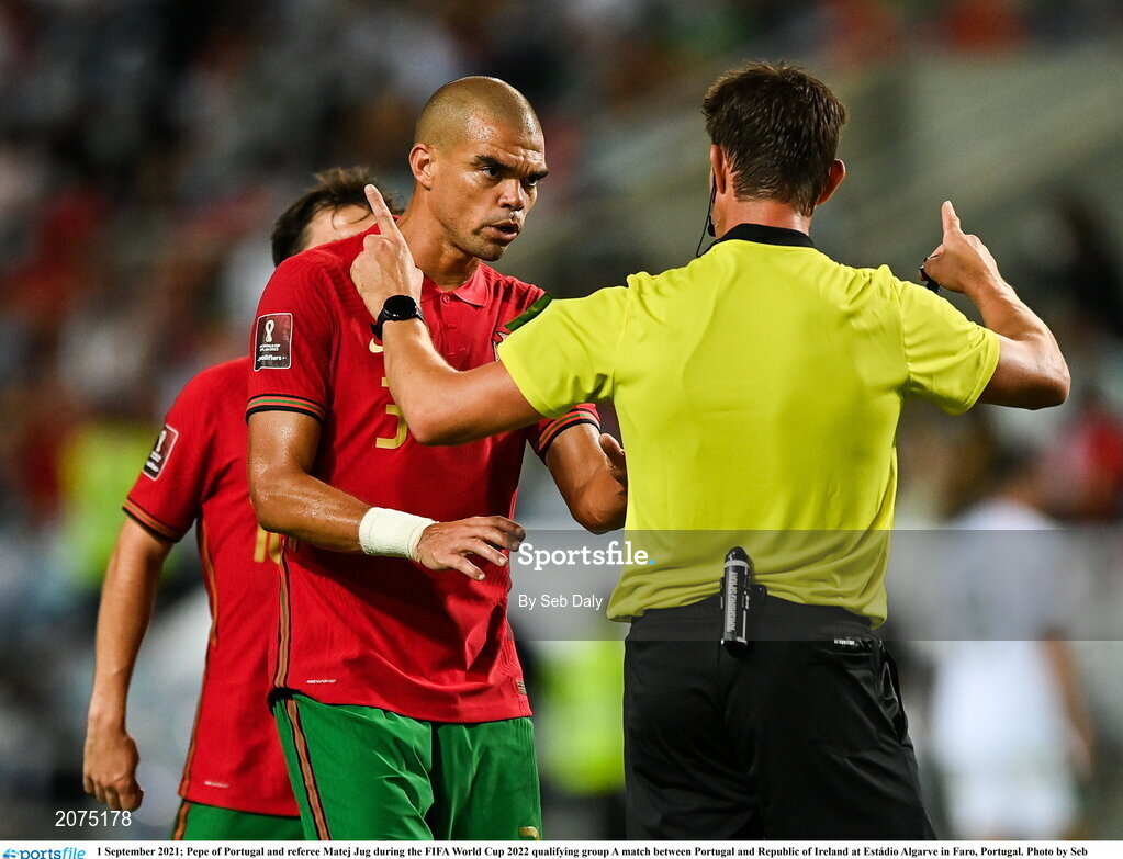 1 September 2021; Pepe of Portugal and referee Matej Jug during the FIFA World Cup 2022 qualifying group A match between Portugal and Republic of Ireland at Estádio Algarve in Faro, Portugal. Photo by Seb Daly/Sportsfile