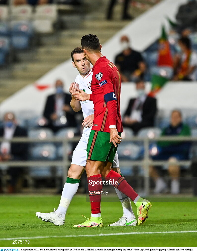 1 September 2021; Seamus Coleman of Republic of Ireland and Cristiano Ronaldo of Portugal during the FIFA World Cup 2022 qualifying group A match between Portugal and Republic of Ireland at Estádio Algarve in Faro, Portugal. Photo by Seb Daly/Sportsfile