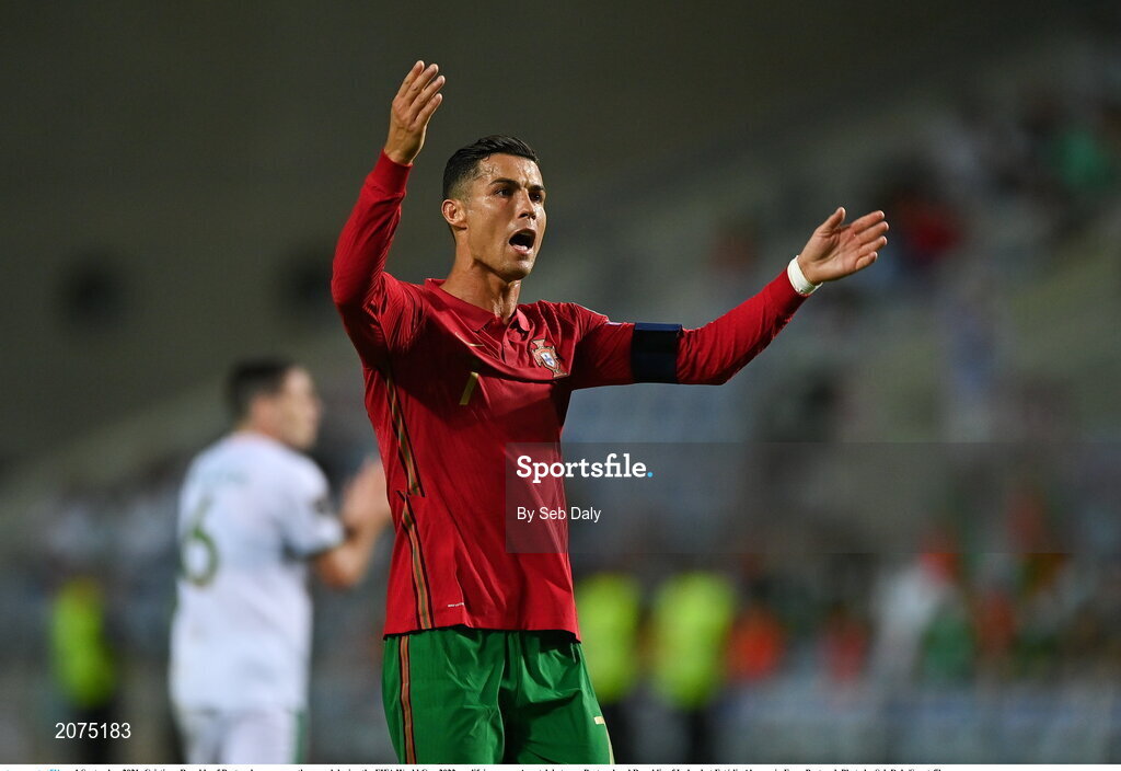 1 September 2021; Cristiano Ronaldo of Portugal encourages the crowd during the FIFA World Cup 2022 qualifying group A match between Portugal and Republic of Ireland at Estádio Algarve in Faro, Portugal. Photo by Seb Daly/Sportsfile