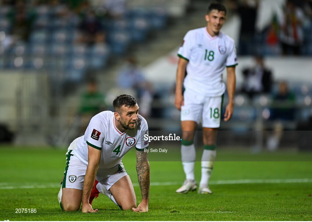 1 September 2021; Shane Duffy of Republic of Ireland reacts after his side concede a goal, scored by Cristiano Ronaldo of Portugal, during the FIFA World Cup 2022 qualifying group A match between Portugal and Republic of Ireland at Estádio Algarve in Faro, Portugal. Photo by Seb Daly/Sportsfile
