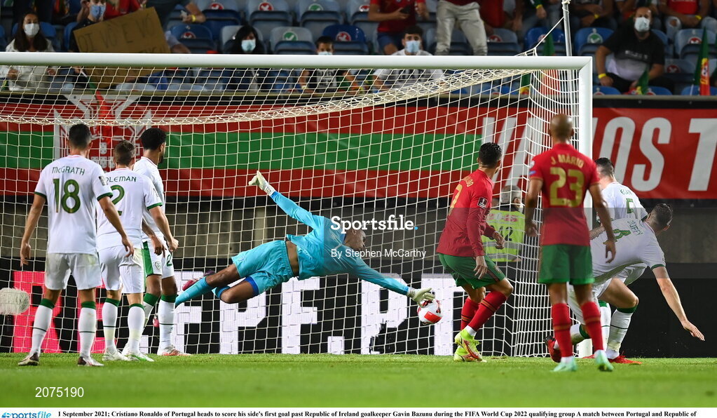 1 September 2021; Cristiano Ronaldo of Portugal heads to score his side's first goal past Republic of Ireland goalkeeper Gavin Bazunu during the FIFA World Cup 2022 qualifying group A match between Portugal and Republic of Ireland at Estádio Algarve in Faro, Portugal. Photo by Stephen McCarthy/Sportsfile