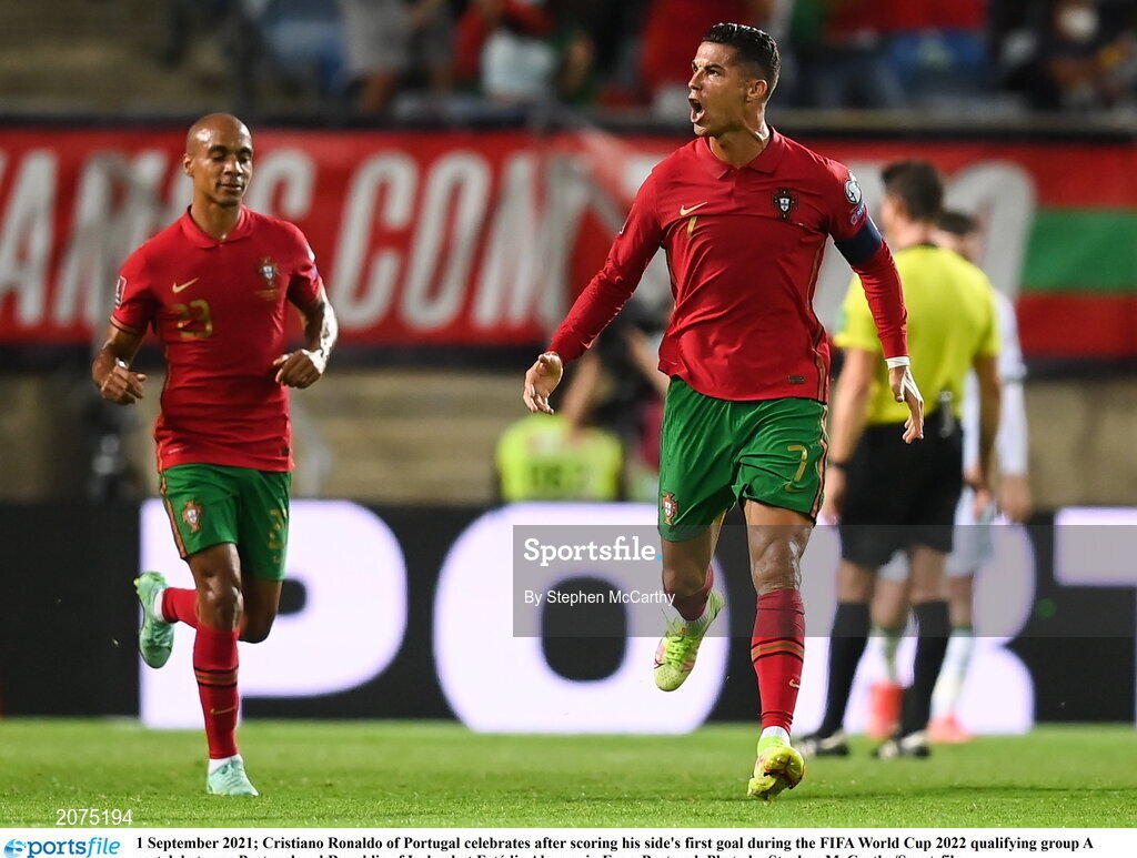 1 September 2021; Cristiano Ronaldo of Portugal celebrates after scoring his side's first goal during the FIFA World Cup 2022 qualifying group A match between Portugal and Republic of Ireland at Estádio Algarve in Faro, Portugal. Photo by Stephen McCarthy/Sportsfile