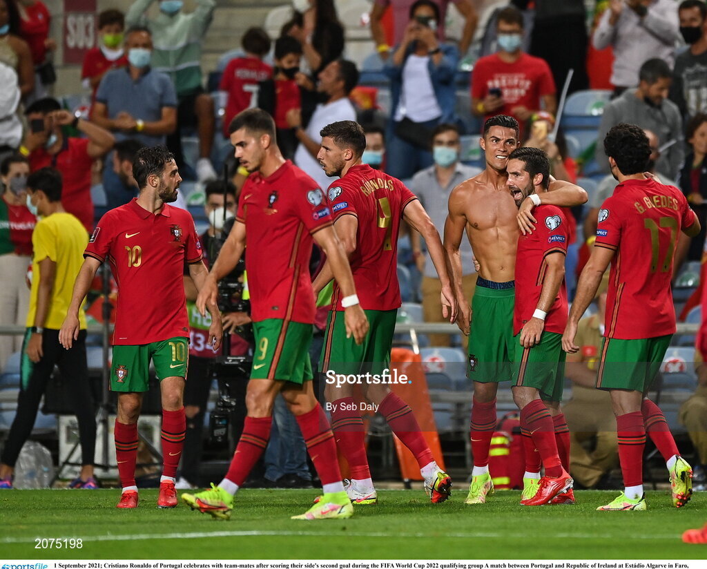 1 September 2021; Cristiano Ronaldo of Portugal celebrates with team-mates after scoring their side's second goal during the FIFA World Cup 2022 qualifying group A match between Portugal and Republic of Ireland at Estádio Algarve in Faro, Portugal. Photo by Seb Daly/Sportsfile