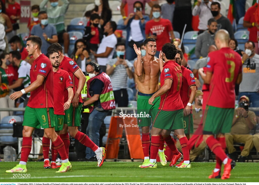 1 September 2021; Cristiano Ronaldo of Portugal celebrates with team-mates after scoring their side's second goal during the FIFA World Cup 2022 qualifying group A match between Portugal and Republic of Ireland at Estádio Algarve in Faro, Portugal. Photo by Seb Daly/Sportsfile