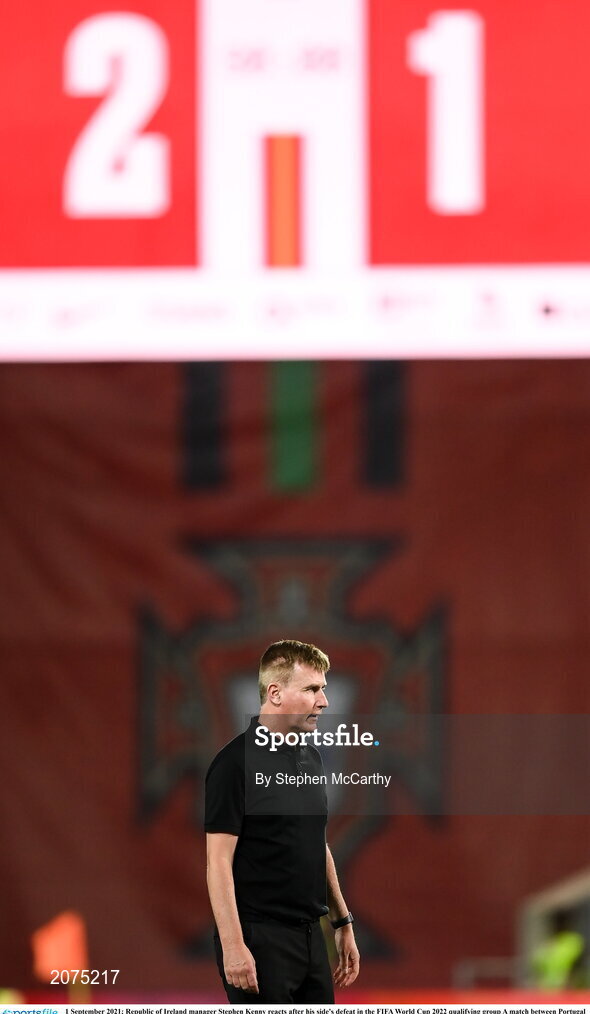 1 September 2021; Republic of Ireland manager Stephen Kenny reacts after his side's defeat in the FIFA World Cup 2022 qualifying group A match between Portugal and Republic of Ireland at Estádio Algarve in Faro, Portugal. Photo by Stephen McCarthy/Sportsfile
