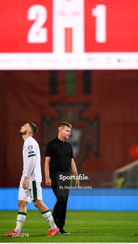 1 September 2021; Republic of Ireland manager Stephen Kenny, right, and Matt Doherty of Republic of Ireland reacts after their side's defeat in the FIFA World Cup 2022 qualifying group A match between Portugal and Republic of Ireland at Estádio Algarve in Faro, Portugal. Photo by Stephen McCarthy/Sportsfile