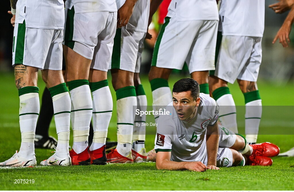 1 September 2021; Josh Cullen of Republic of Ireland lies behind his side's wall before a freekick during the FIFA World Cup 2022 qualifying group A match between Portugal and Republic of Ireland at Estádio Algarve in Faro, Portugal. Photo by Seb Daly/Sportsfile