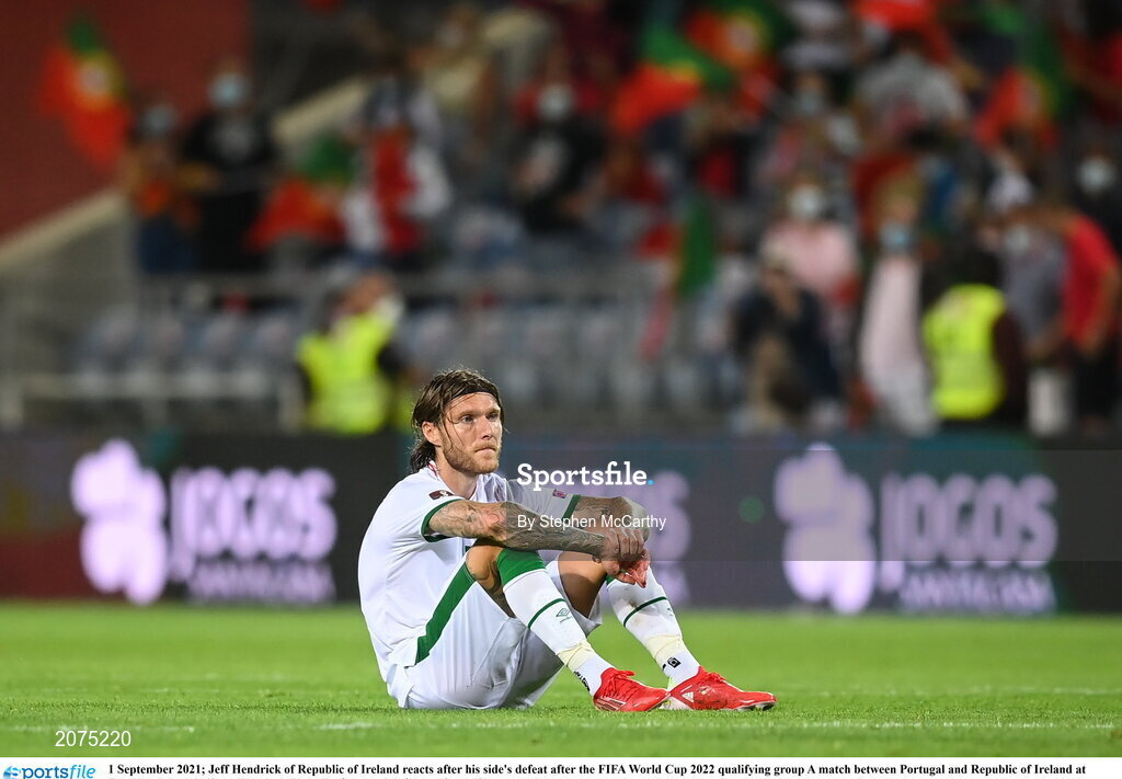 1 September 2021; Jeff Hendrick of Republic of Ireland reacts after his side's defeat after the FIFA World Cup 2022 qualifying group A match between Portugal and Republic of Ireland at Estádio Algarve in Faro, Portugal. Photo by Stephen McCarthy/Sportsfile