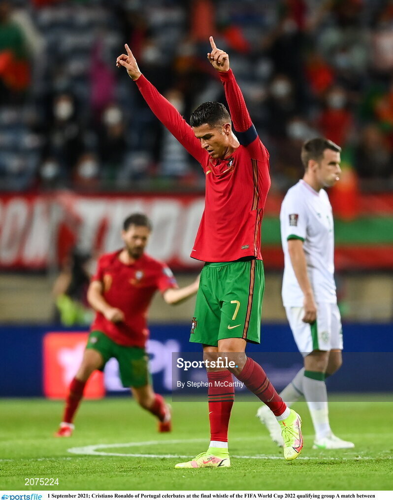 1 September 2021; Cristiano Ronaldo of Portugal celebrates at the final whistle of the FIFA World Cup 2022 qualifying group A match between Portugal and Republic of Ireland at Estádio Algarve in Faro, Portugal. Photo by Stephen McCarthy/Sportsfile