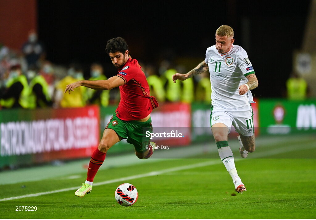1 September 2021; James McClean of Republic of Ireland in action against Gonçalo Inácio of Portugal during the FIFA World Cup 2022 qualifying group A match between Portugal and Republic of Ireland at Estádio Algarve in Faro, Portugal. Photo by Seb Daly/Sportsfile