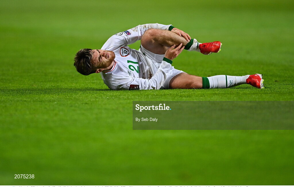 1 September 2021; Aaron Connolly of Republic of Ireland await medical treatment during the FIFA World Cup 2022 qualifying group A match between Portugal and Republic of Ireland at Estádio Algarve in Faro, Portugal. Photo by Seb Daly/Sportsfile