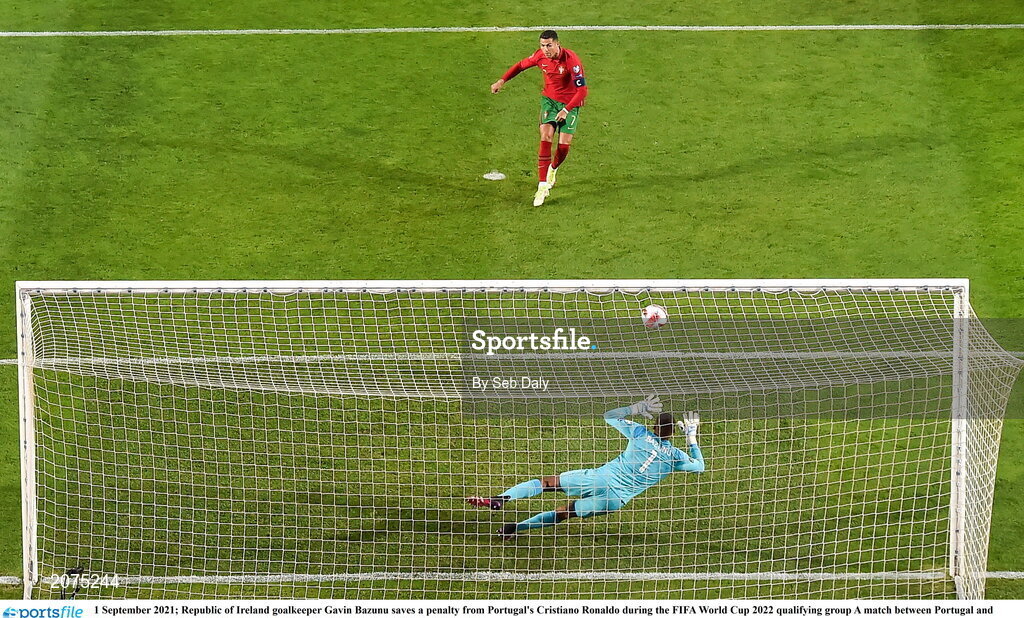 1 September 2021; Republic of Ireland goalkeeper Gavin Bazunu saves a penalty from Portugal's Cristiano Ronaldo during the FIFA World Cup 2022 qualifying group A match between Portugal and Republic of Ireland at Estádio Algarve in Faro, Portugal. Photo by Seb Daly/Sportsfile