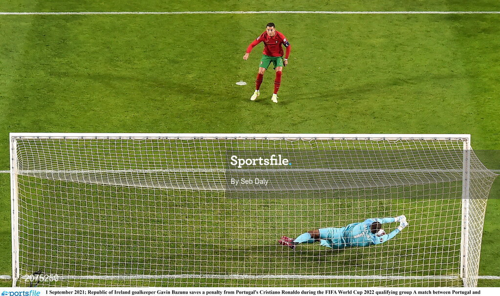 1 September 2021; Republic of Ireland goalkeeper Gavin Bazunu saves a penalty from Portugal's Cristiano Ronaldo during the FIFA World Cup 2022 qualifying group A match between Portugal and Republic of Ireland at Estádio Algarve in Faro, Portugal. Photo by Seb Daly/Sportsfile